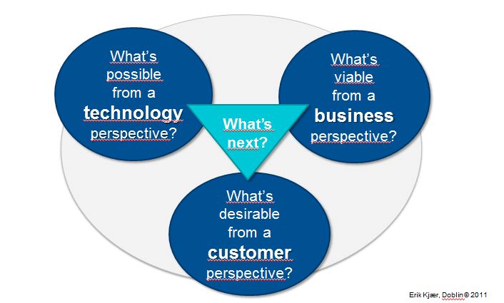Da er det lurt å se på aktører som ligger helt i randsonen av vår egen bransje, kanskje utenfor. Eller vi kan bryte helt ut og leke med mulige kundebehov verken vi eller kunden har oppdaget ennå, for eksempel slik Copenhagen Institute For Future Studies (www.cifs.dk) kan inspirere oss til.